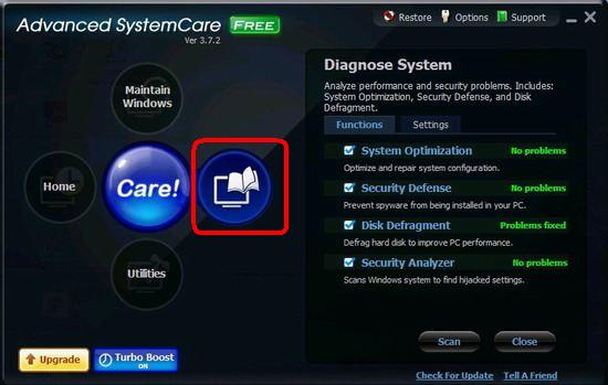 এডভান্সড সিস্টেম কেয়ার (Advanced SystemCare) চালু করে কেয়ার অপশনে ক্লিক করলেই এটি স্কেন করা শুরু করে। এর প্রাইভেসি সুইপ পিসিতে জমা থাকা বিভিন্ন হিস্ট্রী রিমুভ করে থাকে। এ সফটওয়্যারটি বিভিন্ন ধরণের জাঙ্ক ফাইলস রিমুভ করে ডিস্কের জায়গা পুণরুদ্ধার করে থাকে। কোন সমস্যা থাকলে খুব সহজেই রিপেয়ার করা যায়। এ জন্য উপরের চিত্রে লাল চিহ্নিত স্থানে (Maintain Windows ) ক্লিক করে Care এ ক্লিক করুন।
